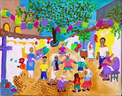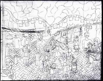 Showing merchants, the tree in the background (symbol of life and growth). The warmth that you feel when experience Olvera. I used the sun peeking out from behind the buildings and the tree to show warmth. The child on a mother’s lap. A lot of the merchants children have grown up on this street.