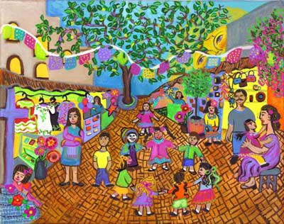 I paint in almost a child like style that is very primitive, but I try to leave no stone left unturned on the details. The street is rounded to capture the perspective (AIW) "alice in wonderland"** and to give the illusion of movement and history on the calle. I can remember walking on it and feeling how the bricks were worn and even seemed to be rounded from the constant foot traffic… that it has seen over the many years. I wanted to capture the fact that Calle Olvera was alive and flourishing even after 75 years.
